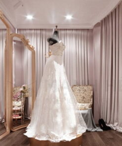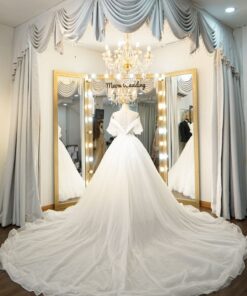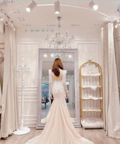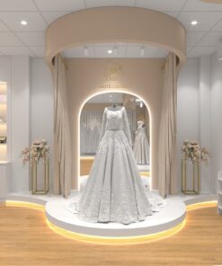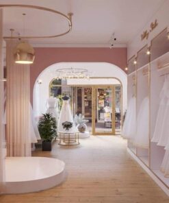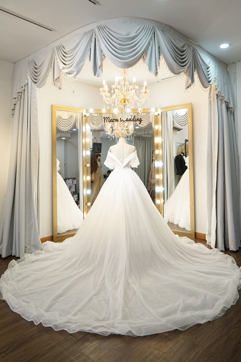 Một bộ váy xòe rất đẹp và diện tích cần rất rộng để cô dâu xinh sắn có thể thay đồ và ngắm chọn bộ váy xinh đẹp của mình. Phòng thay đồ cho ảnh viện áo cưới được rộng và có gương lớn và bục cao nên cần thiết kế khác hơn 1 chút.