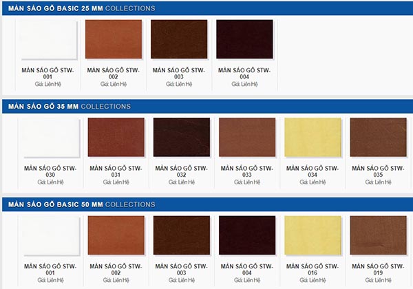 Bảng báo gí chi tiết các mẫu rèm sáo gỗ có trên thị trường hiện nay.