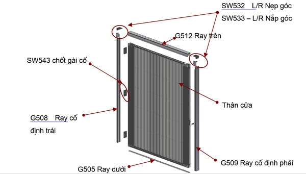 - Các bộ phận chính của khung cửa bao gồm: thanh khung, thanh nẹp, góc, tay nắm, ổ khóa, ray trượt (đối với cửa lưới lùa).