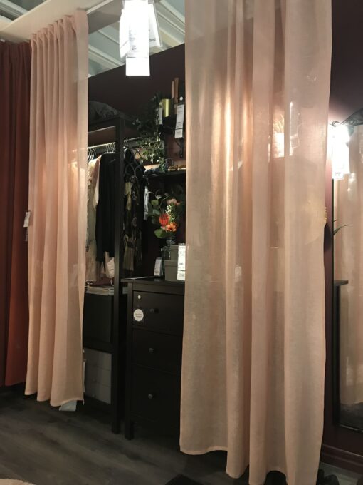 Các showroom bán sản phẩm quần áo có những phòng thay đồ. với khả năng che chắn kín kẽ giúp khách hàng cảm thấy thỏa mái và yên tâm khi thử đồ. Thường là những sản phẩm rèm vải có màu sắc sáng và trơn một màu.
