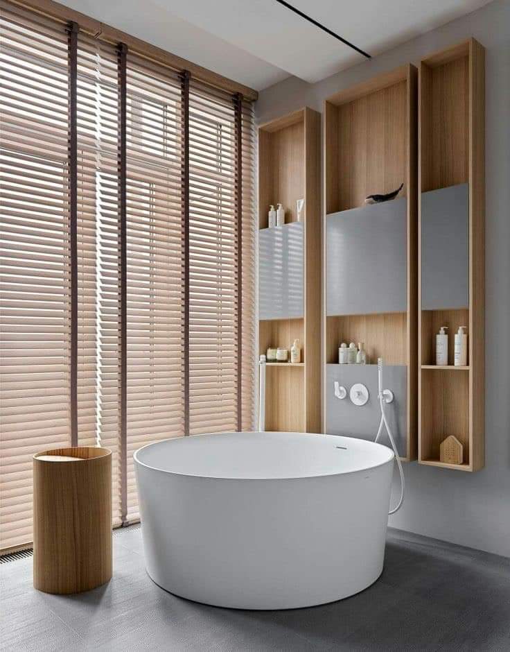 Không gian phòng tắm có các dạng như tắm bồn, Tắm sen vòi hoặc phòng tắm không có vách kính là những nơi cần sử dụng rèm dạng vải không thấm nước. Còn phòng tắm khô hoặc không gian phòng tắm có cửa sổ thông gió hoặc lấy sáng. Chúng ta có thể dùng các loại rèm như rèm cuốn lưới, hoặc rèm sáo nhựa chống nước.