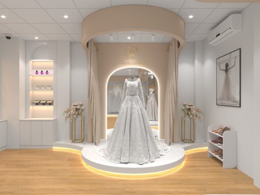 Một bộ váy xòe rất đẹp và diện tích cần rất rộng để cô dâu xinh sắn có thể thay đồ và ngắm chọn bộ váy xinh đẹp của mình. Phòng thay đồ cho ảnh viện áo cưới được rộng và có gương lớn và bục cao nên cần thiết kế khác hơn 1 chút.
